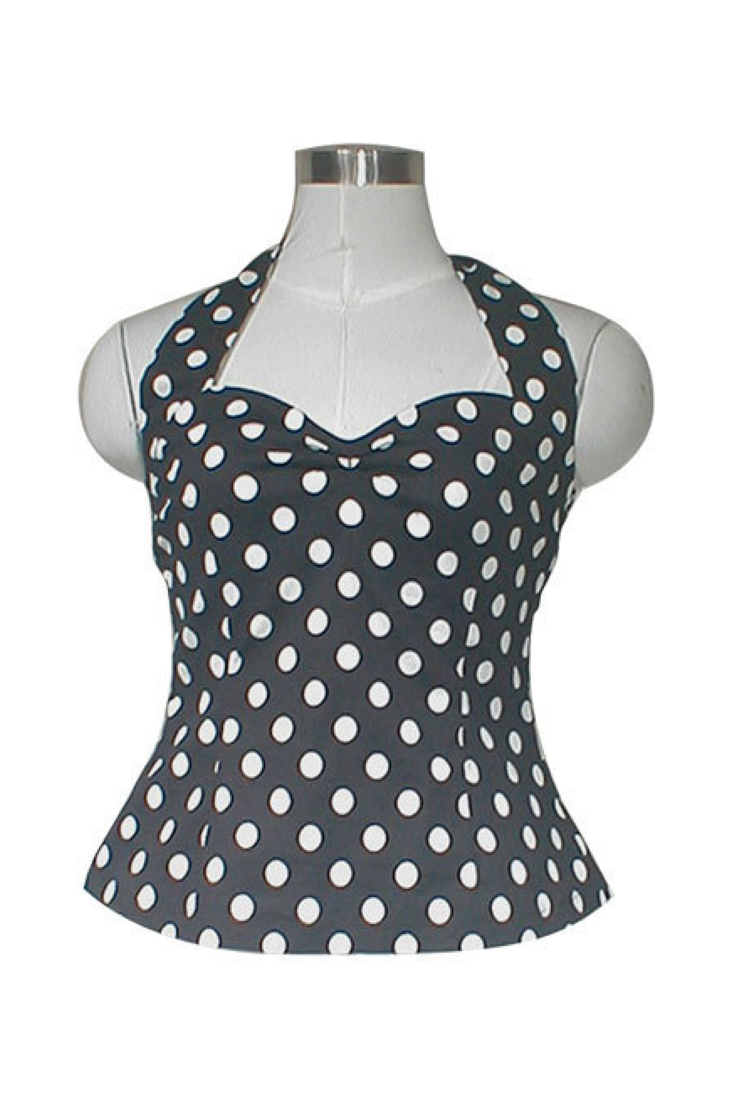Camiseta estilo años 50 negra de algodón elástico con lunares blancos, cremallera lateral, favorecedor escote en forma de corazón y tirantes que se atan en el cuello.