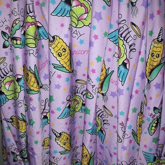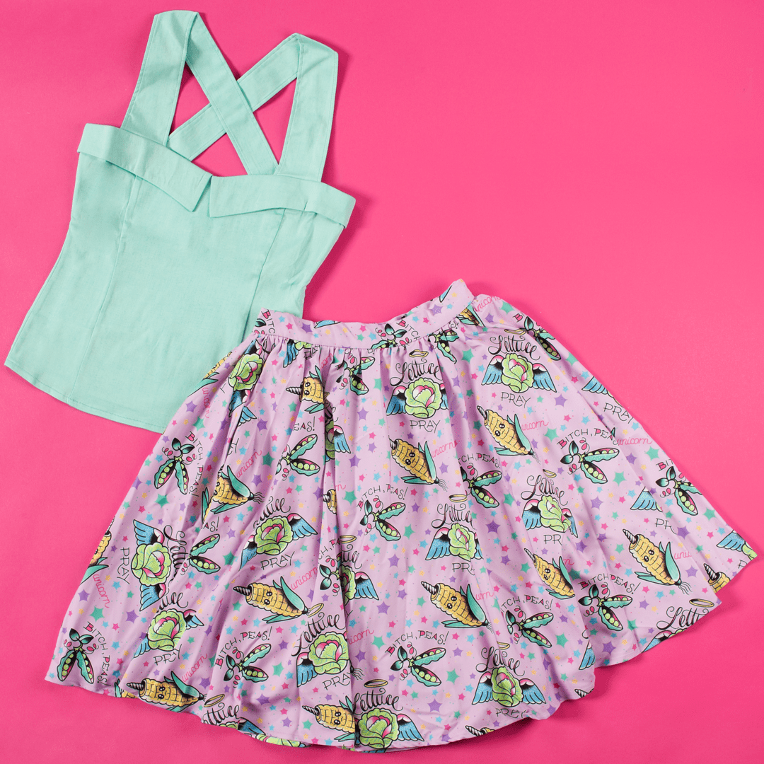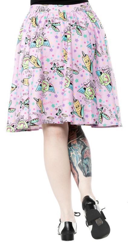 Falda Kawaii de capa con estampado en colores vibrantes de mazorcas unicornio , guisantes y lechugas voladoras sobre un fondo rosa pastel.