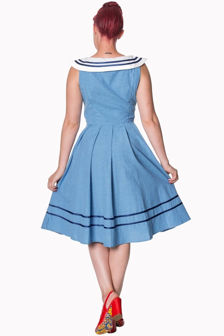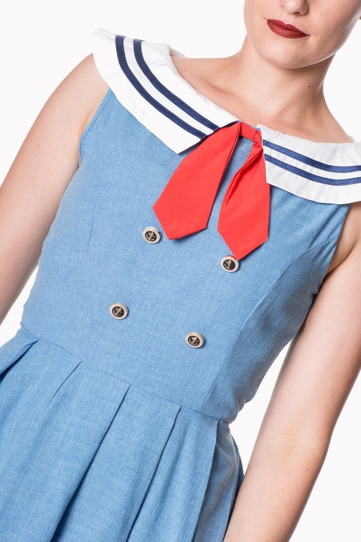 Vestido azul celeste plisado de inspiración vintage, con corbatín rojo en el cuello y botones decorativos en color dorado con dibujo de un ancla.