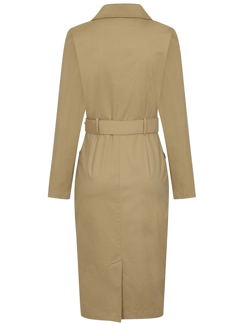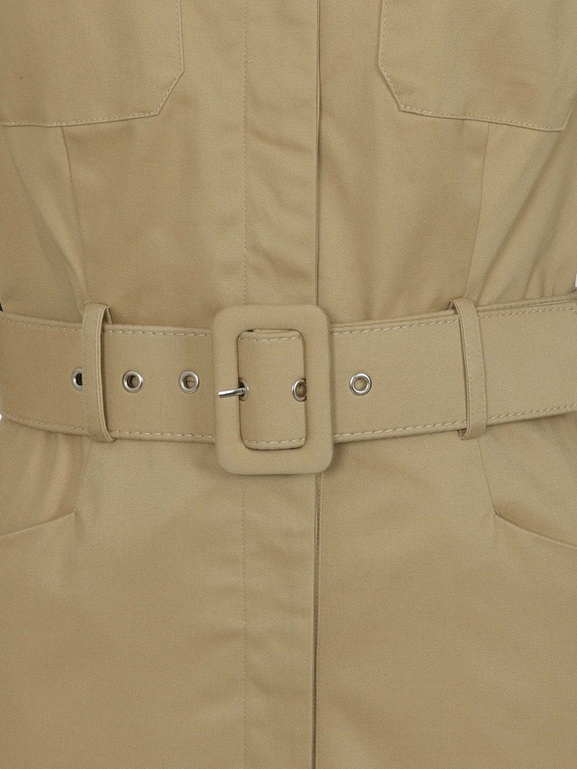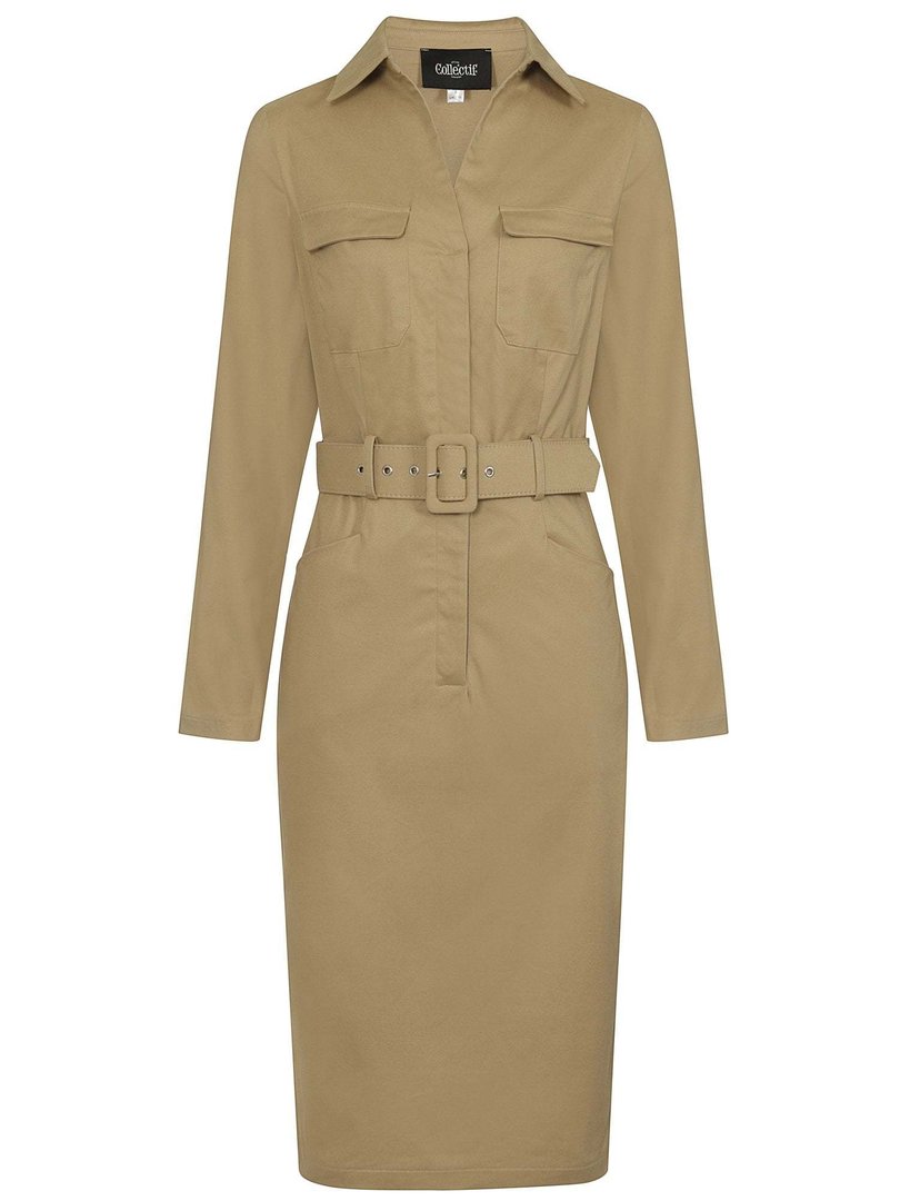 Vestido de tubo Safari en beige que termina por debajo de la rodilla y se ajusta a la cintura con un cinturón ancho